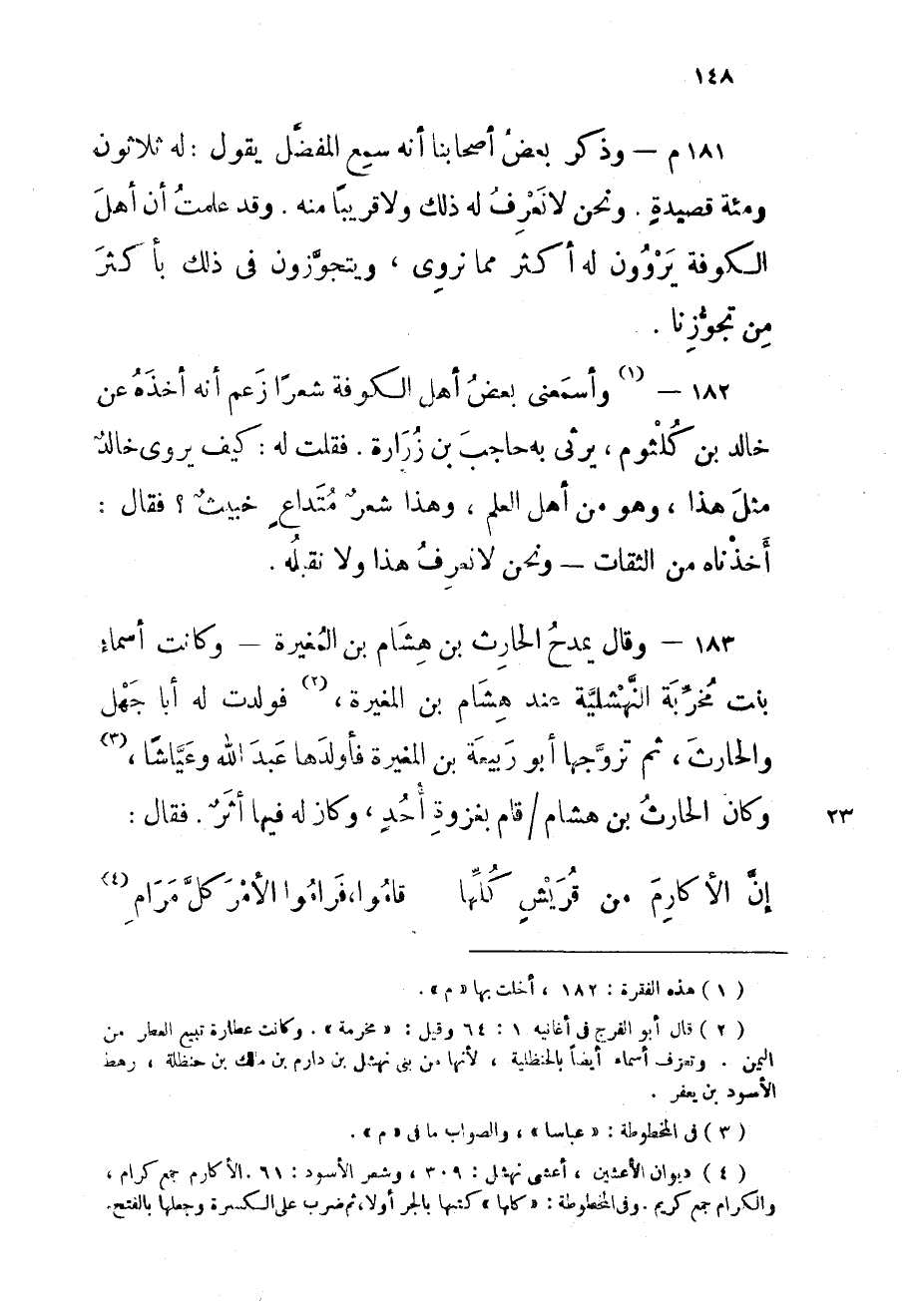 183 - وَقَالَ يمدح الْحَارِث بن هِشَام بن الْمُغيرَة وَكَانَت أَسمَاء بنت مخربة النهشلية عِنْد هِشَام بن الْمُغيرَة فَولدت لَهُ أَبَا جهل والْحَارث ثمَّ تزَوجهَا أَبُو ربيعَة بن الْمُغيرَة فأولدها عبد الله وعياشا وَكَانَ الْحَارِث بن هِشَام قَامَ بغزوة أحد وَكَانَ لَهُ فِيهَا أثر