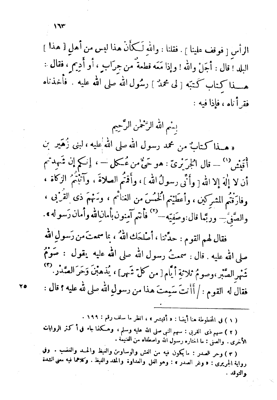 هَذَا كتاب من مُحَمَّد رَسُول الله صلى الله عَلَيْهِ وَسلم لبنى زُهَيْر بن أقيش قَالَ الجريرى هُوَ حى من عكل إِنَّكُم إِن شهدتم أَن لَا إِلَه إِلَّا الله وأنى رَسُول الله وأقمتم الصَّلَاة وَآتَيْتُم الزَّكَاة وفارقتم الْمُشْركين وأعطيتم الْخمس من الْغَنَائِم وَسَهْم ذى الْقُرْبَى والصفى وَرُبمَا قَالَ وَصفيه فَأنْتم آمنون بِأَمَان الله وأمان رَسُوله