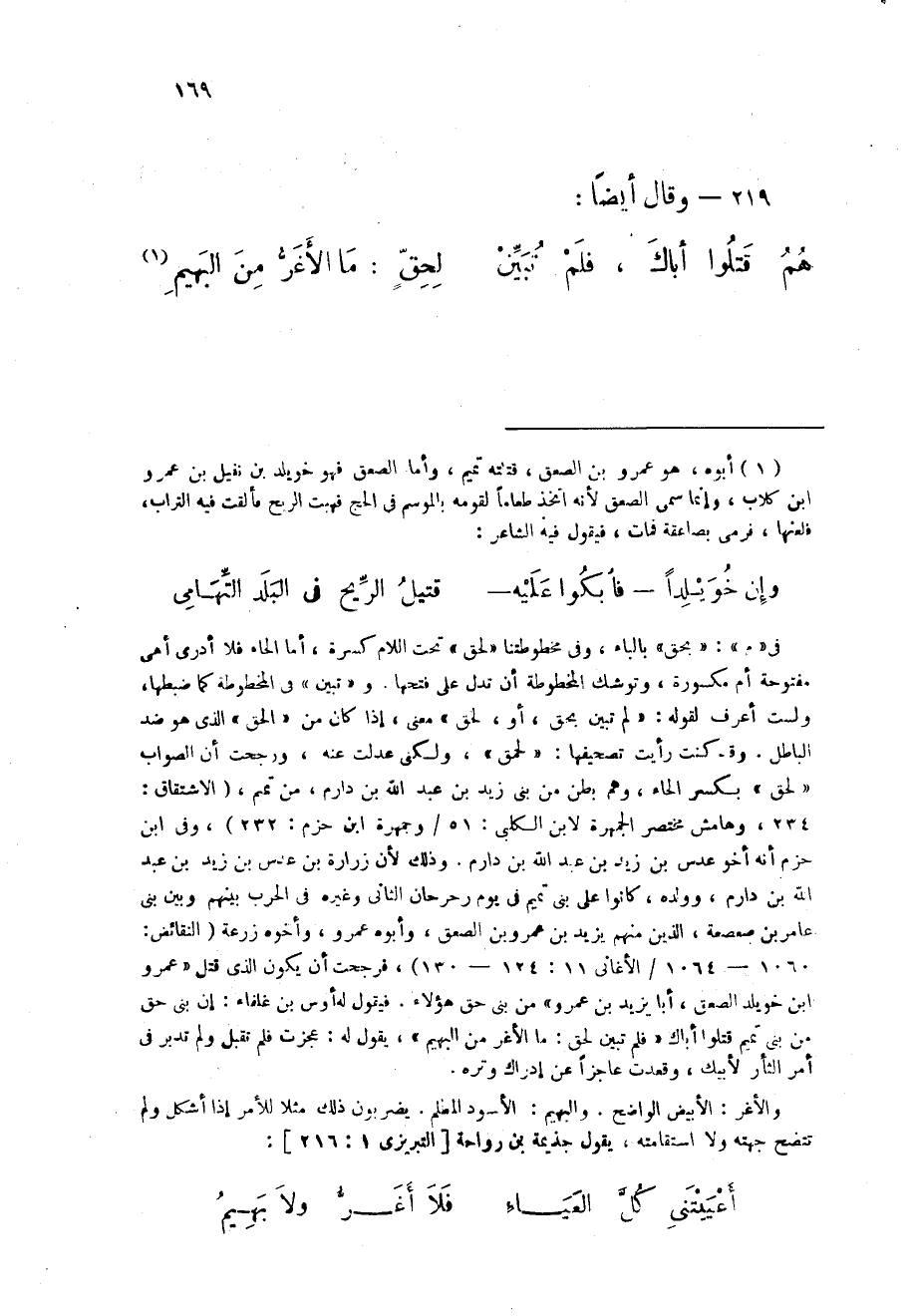 (هم قتلوا أَبَاك فَلم تبين ... لحق مَا الْأَغَر من البهيم)