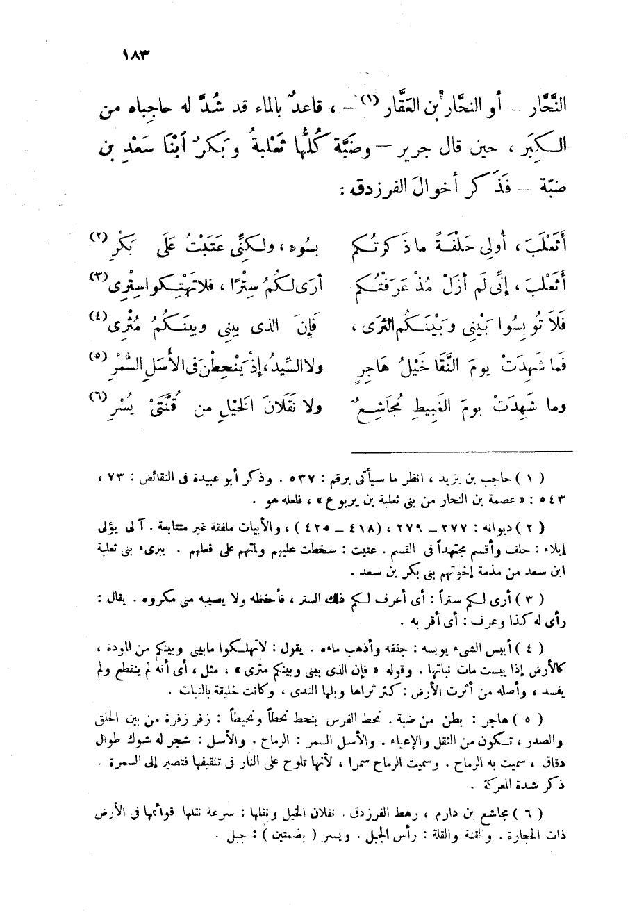 النحار أَو النحار بن الْعقار قَاعد بِالْمَاءِ قد شدّ لَهُ حاجباه من الْكبر حِين قَالَ جرير وضبة كلهَا ثَعْلَبَة وَبكر ابْنا سعد بن ضبة فَذكر أخوال الفرزدق