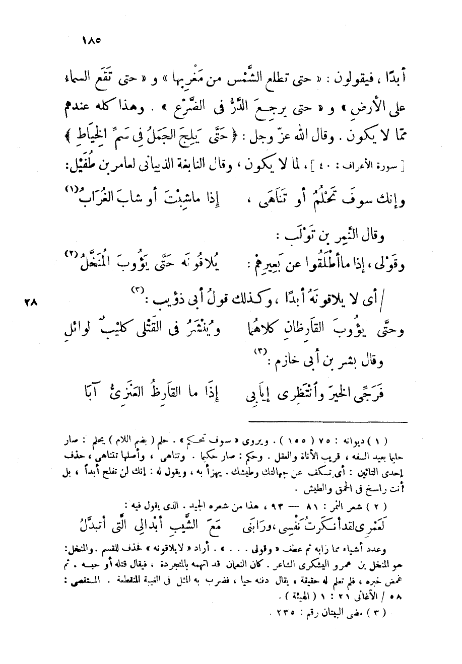 وَقَالَ الله عز وَجل {حَتَّى يلج الْجمل فِي سم الْخياط} لما لَا يكون وَقَالَ النَّابِغَة الذبيانى لعامر بن طفيل