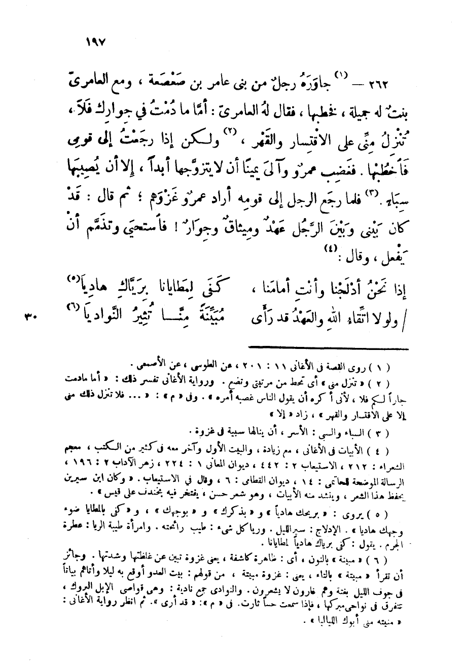 262 - جاوره رجل من بنى عَامر بن صعصعة وَمَعَ العامرى بنت لَهُ جميلَة فَخَطَبَهَا فَقَالَ لَهُ العامرى أما مَا دمت فِي جوارك فَلَا تنزل منى على الاقتسار والقهر وَلَكِن إِذا رجعت إِلَى قومى فاخطبها