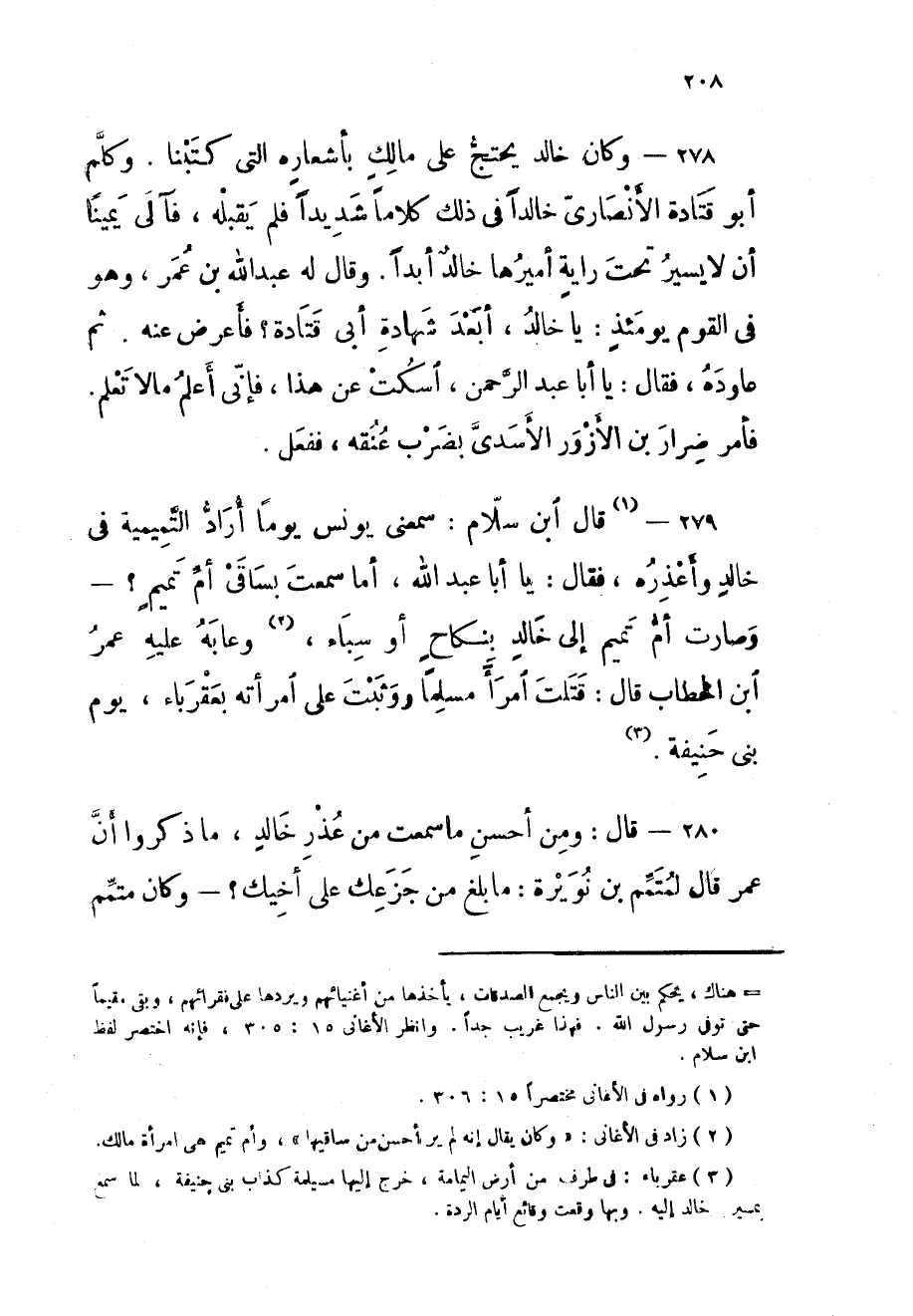 279 - قَالَ ابْن سَلام سمعنى يُونُس يَوْمًا أَرَادَ التميمية فى خَالِد وأعذره فَقَالَ يَا أَبَا عبد الله أما سَمِعت بساقى أم تَمِيم وَصَارَت أم تَمِيم إِلَى خَالِد بِنِكَاح أَو سباء وعابه عَلَيْهِ عمر ابْن الْخطاب قَالَ قتلت امْرأ مُسلما وَوَثَبْت على امْرَأَته بعقرباء يَوْم بنى حنيفَة