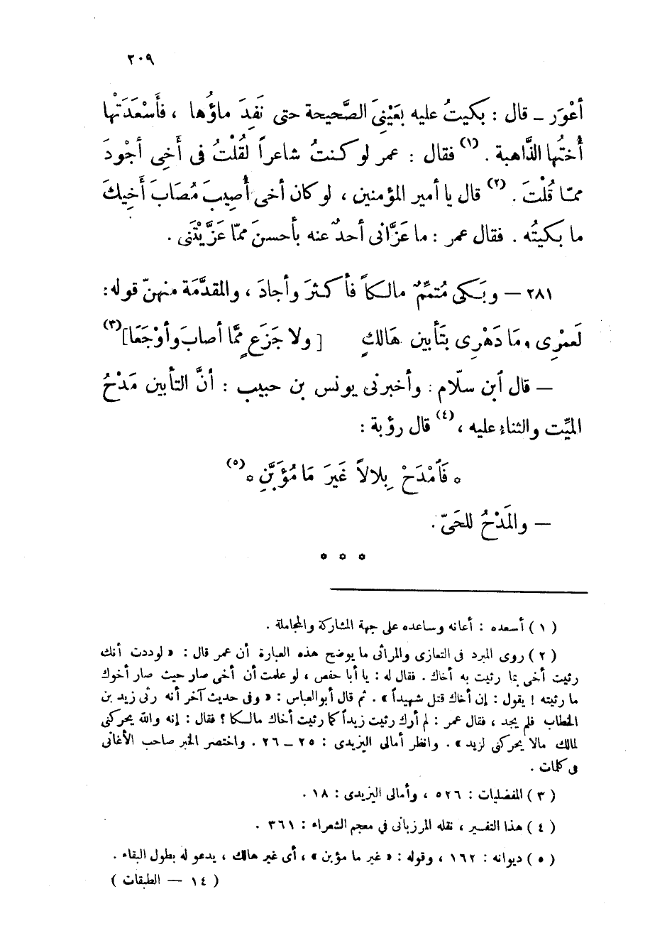 281 - وَبكى متمم مَالِكًا فَأكْثر وأجاد والمقدمة مِنْهُنَّ قَوْله