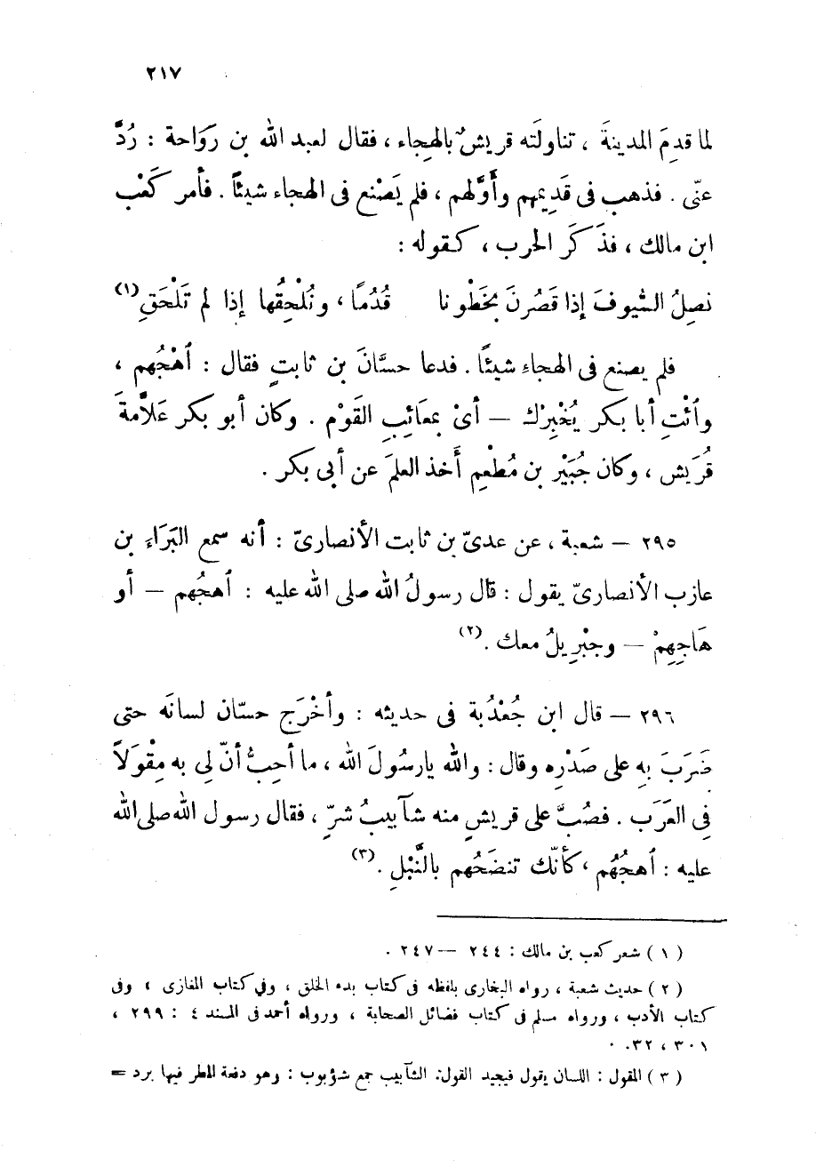 296 - قَالَ ابْن جعدبه فى حَدِيثه وَأخرج حسان لِسَانه حَتَّى ضرب بِهِ على صَدره وَقَالَ وَالله يَا رَسُول الله مَا أحب أَن لى بِهِ مقولا فى الْعَرَب