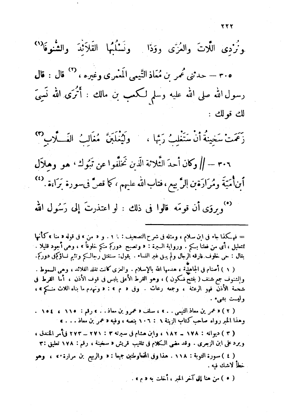 305 - حَدَّثَنى عمر بن معَاذ التيمى المعمرى وَغَيره قَالَ قَالَ رَسُول الله صلى الله عَلَيْهِ وَسلم لكعب بن مَالك أَتَرَى الله نسى لَك قَوْلك