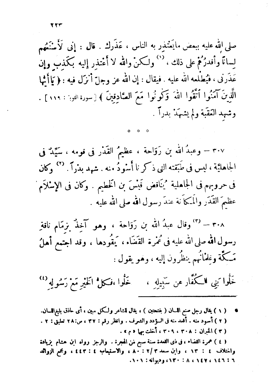 307 - وَعبد الله بن رَوَاحَة عَظِيم الْقدر فى قومه سيد فى الْجَاهِلِيَّة لَيْسَ فى طبقته الَّتِى ذكرنَا أسود مِنْهُ