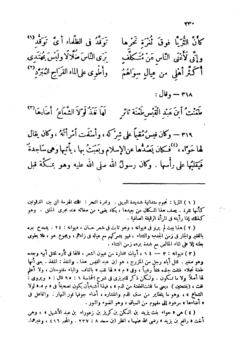 319 - وَكَانَ قيس مُقيما على شركه وَأسْلمت امْرَأَته وَكَانَ يُقَال لَهَا حَوَّاء فَكَانَ يصدها عَن الْإِسْلَام ويعبث بهَا يَأْتِيهَا وهى سَاجِدَة فيقلبها على رَأسهَا