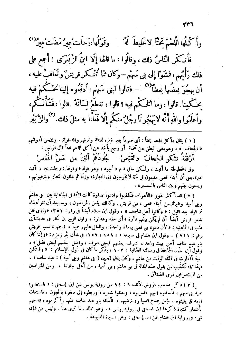 فَأنْكر النَّاس ذَلِك وَقَالُوا مَا قَالَهَا إِلَّا ابْن الزِّبَعْرَى أجمع على ذَلِك رَأْيهمْ فَمَشَوْا إِلَى بنى سهم وَكَانَ مِمَّا تنكر قُرَيْش وتعاقب عَلَيْهِ أَن يهجو بَعْضهَا بَعْضًا فَقَالُوا لبنى سهم ادفعوه إِلَيْنَا نحكم فِيهِ بحكمنا