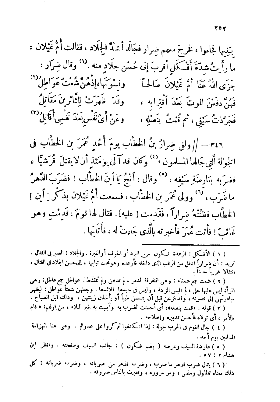 346 - ولقى ضرار بن الْخطاب يَوْم أحد عمر بن الْخطاب فى الجولة الَّتِى جالها الْمُسلمُونَ وَكَانَ قد آلى يَوْمئِذٍ أَن لَا يقتل قرشيا فَضَربهُ بعارضة سَيْفه وَقَالَ انج يَا ابْن الْخطاب فَضرب الدَّهْر مَا ضرب وَولى عمر بن الْخطاب فَسمِعت أم غيلَان بِذكر ابْن الْخطاب فظنته ضِرَارًا فَقدمت عَلَيْهِ فَقَالَ لَهَا قوم قدمت وَهُوَ غَائِب فَأَتَت عمر فَأَخْبَرته بالذى جَاءَت لَهُ فأثابها