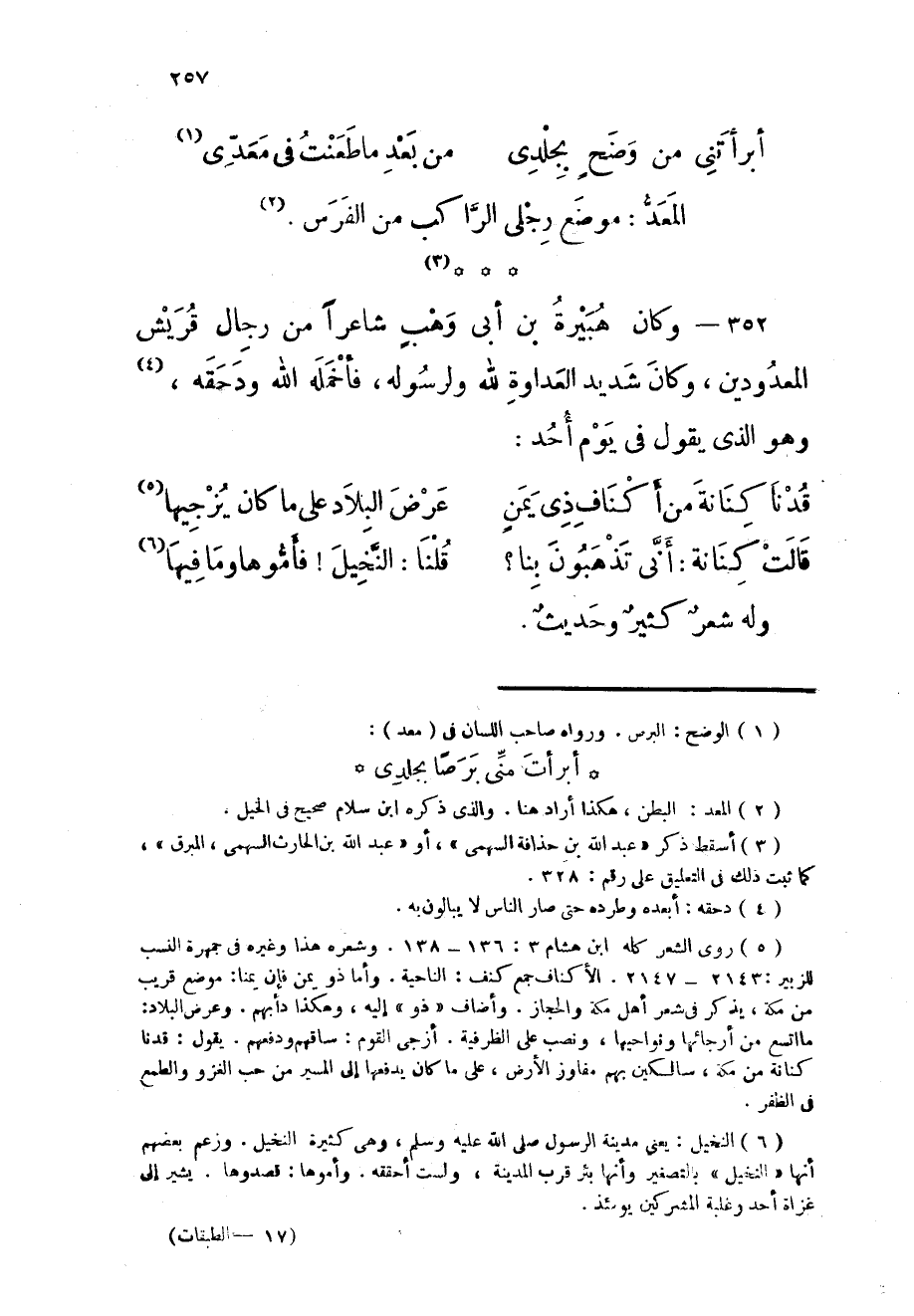 352 - وَكَانَ هُبَيْرَة بن أَبى وهب شَاعِرًا من رجال قُرَيْش الْمَعْدُودين وَكَانَ شَدِيد الْعَدَاوَة لله وَلِرَسُولِهِ فأخمله الله ودحقه وَهُوَ الذى يَقُول فى يَوْم أحد