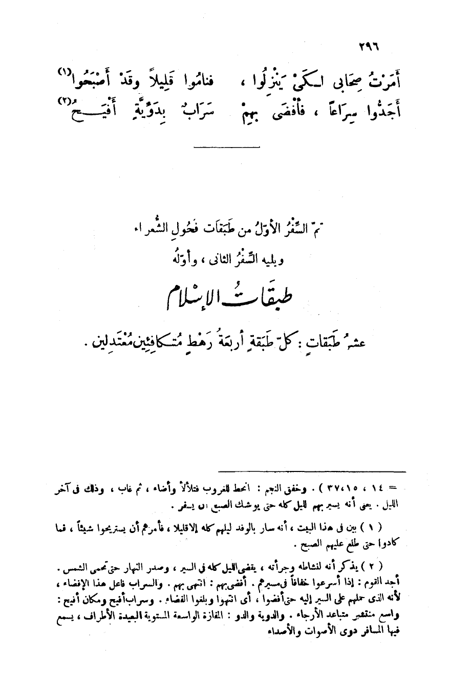(أجدوا سرَاعًا فأفضى بهم ... سراب بدوية أفيح) تمّ السّفر الأول من طَبَقَات فحول الشُّعَرَاء ويليه السّفر الثانى وأوله طَبَقَات الْإِسْلَام عشر طَبَقَات كل طبقَة أَرْبَعَة رَهْط متكافئين معتدلين