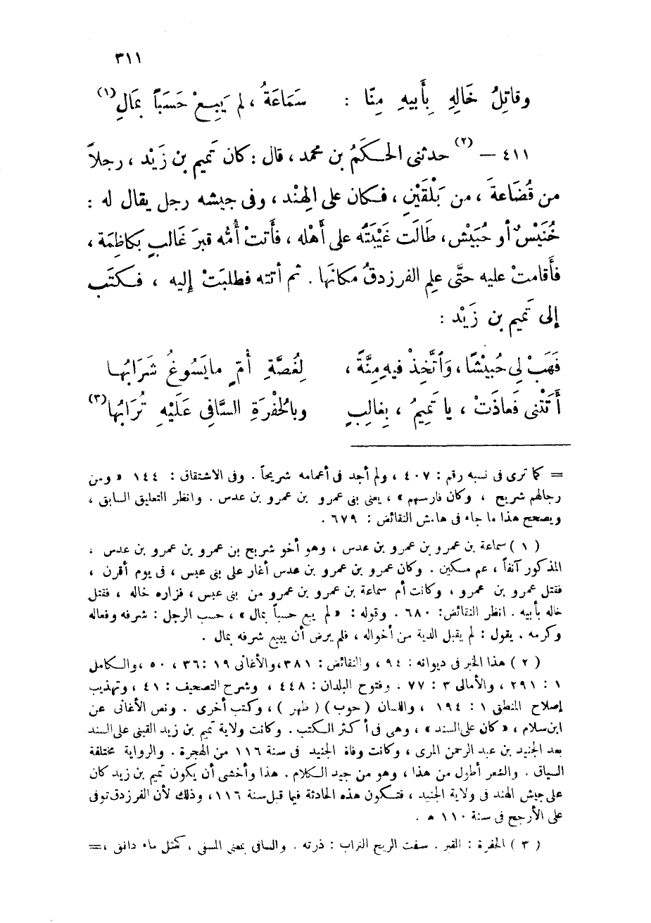 411 - حَدثنِي الحكم بن مُحَمَّد قَالَ كَانَ تَمِيم بن زيد رجلا من قضاعة من بلقين فَكَانَ على الْهِنْد وَفِي جَيْشه رجل يُقَال لَهُ خُنَيْس أَو حُبَيْش طَالَتْ غيبته على أَهله فَأَتَت أمه قبر غَالب بكاظمة فأقامت عَلَيْهِ حَتَّى علم الفرزدق مَكَانهَا ثمَّ أَتَتْهُ فطلبت إِلَيْهِ فَكتب إِلَى تَمِيم بن زيد