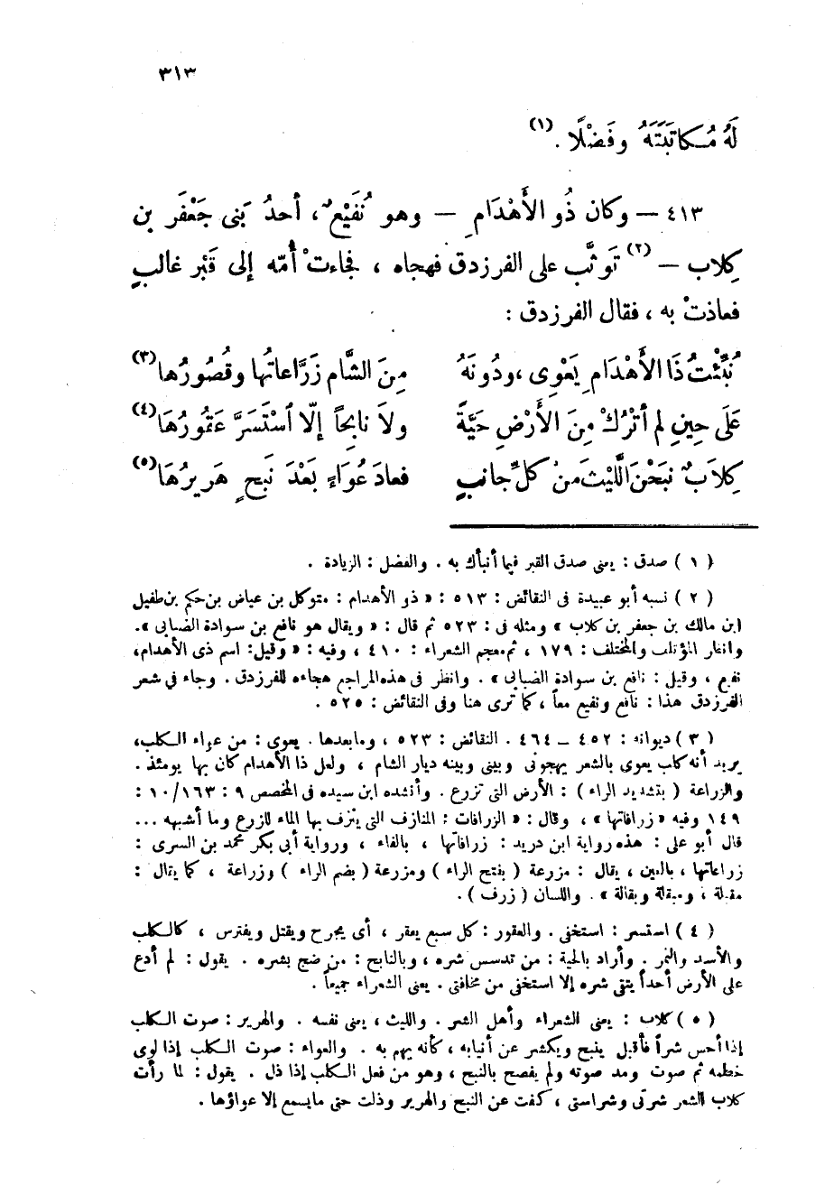 413 - وَكَانَ ذُو الأهدام وَهُوَ نفيع أحد بني جَعْفَر بن كلاب توثب على الفرزدق فهجاه فَجَاءَت أمه إِلَى قبر غَالب فعاذت بِهِ فَقَالَ الفرزدق