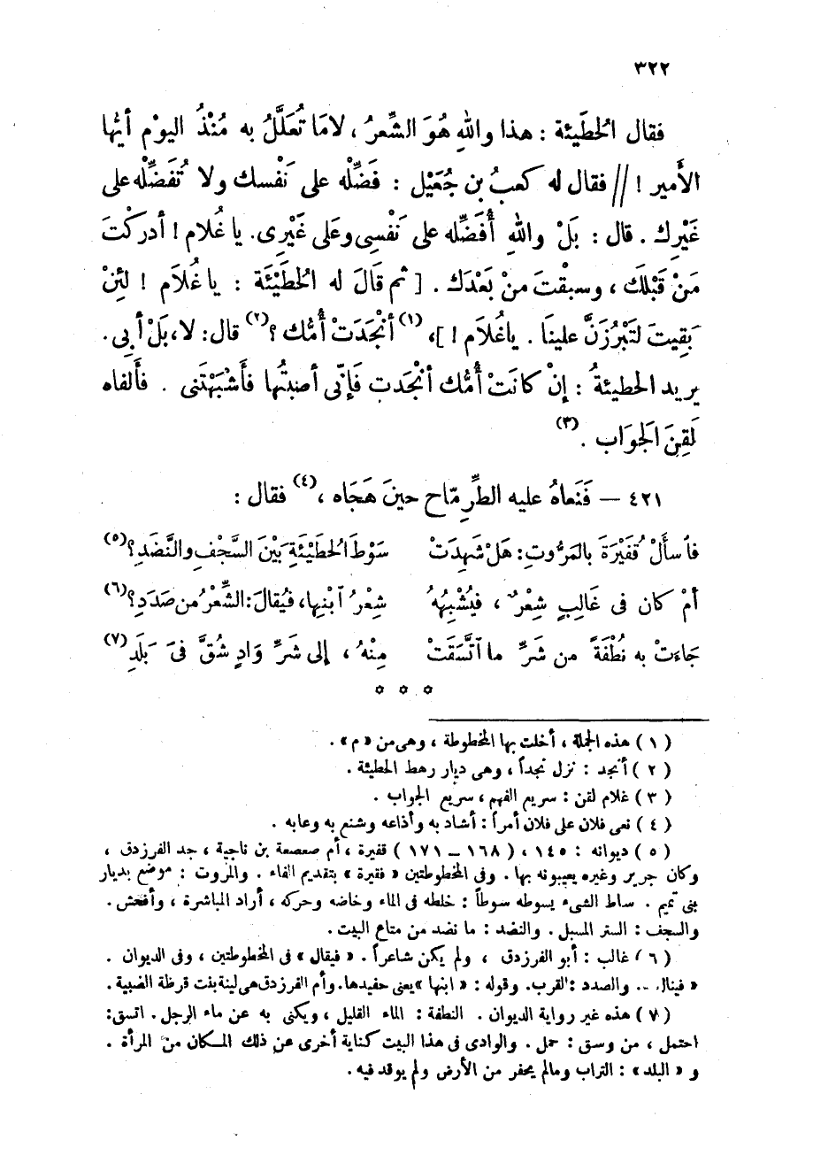 فَقَالَ الحطيئة هَذَا وَالله هُوَ الشّعْر لاما تعلل بِهِ مُنْذُ الْيَوْم أَيهَا الْأَمِير فَقَالَ لَهُ كَعْب بن جعيل فَضله على نَفسك وَلَا تفضله على غَيْرك قَالَ بل وَالله أفضله على نَفسِي وعَلى غَيْرِي ياغلام أدْركْت من قبلك وسبقت من بعْدك ثمَّ قَالَ لَهُ الحطيئة يَا غُلَام لَئِن بقيت لتبرزن علينا يَا غُلَام أنجدت أمك قَالَ لَا بل أَبى يُرِيد الحطيئة إِن كَانَت أمك أنجدت فَإِنِّي أصبتها فأشبهتني فألفاه لقن الْجَواب