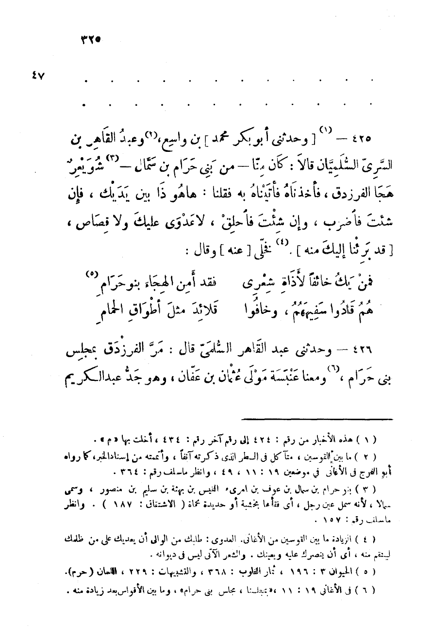 426 - وحَدثني عبد القاهر السّلمِيّ قَالَ مر الفرزدق بِمَجْلِس بني حرَام ومعنا عَنْبَسَة مولى عُثْمَان بن عَفَّان وَهُوَ جد عبد الْكَرِيم