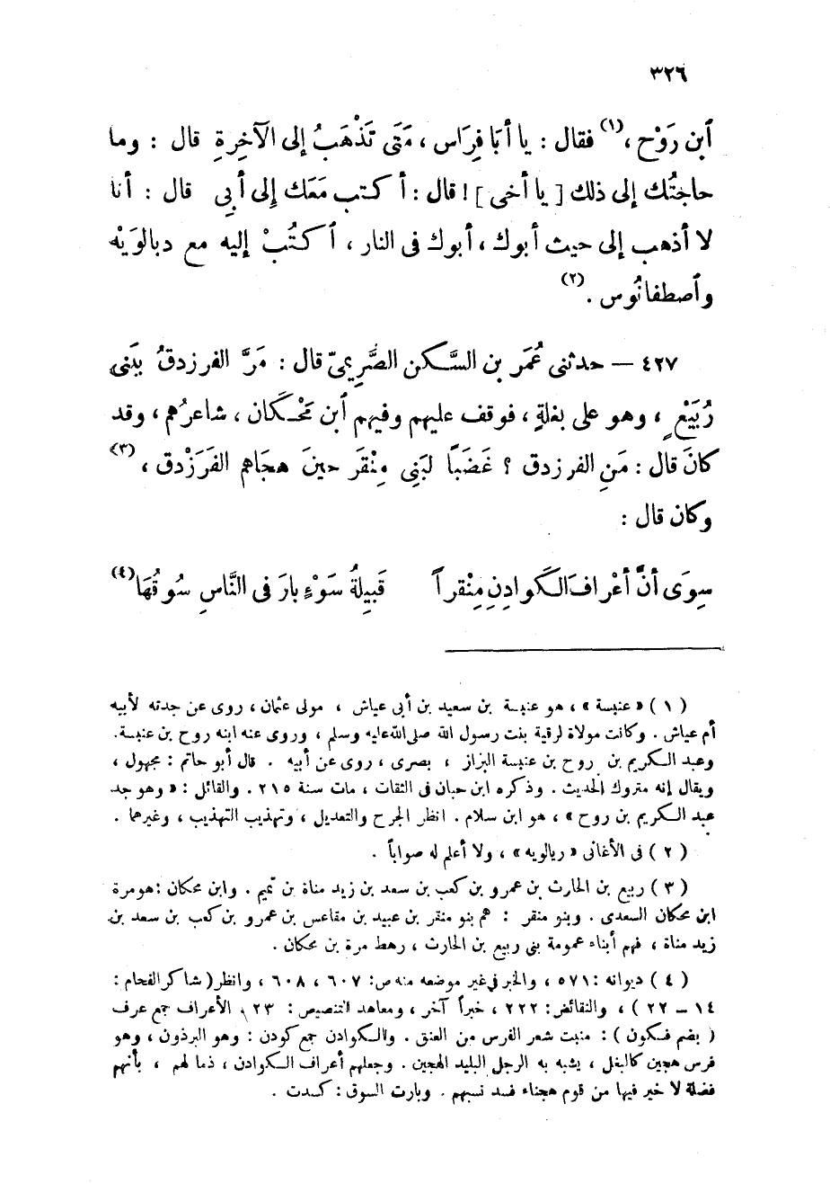 427 - حَدثنِي عمر بن السكن الصريمي قَالَ مر الفرزدق ببني ربيع وَهُوَ على بغلة فَوقف عَلَيْهِم وَفِيهِمْ ابْن محكان شَاعِرهمْ وَقد كَانَ قَالَ من الفرزدق غَضبا لبني منقر حِين هجاهم الفرزدق وَكَانَ قَالَ