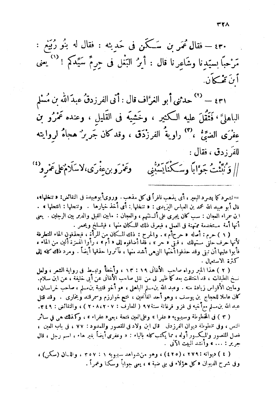 431 - حَدثنِي أَبُو الغراف قَالَ أَتَى الفرزدق عبد الله بن مُسلم الْبَاهِلِيّ فثقل عَلَيْهِ الْكثير وخشيه فِي الْقَلِيل وَعِنْده عَمْرو بن عفرى الضَّبِّيّ راوية الفرزدق وَقد كَانَ جرير هجاه لروايته للفرزدق فَقَالَ