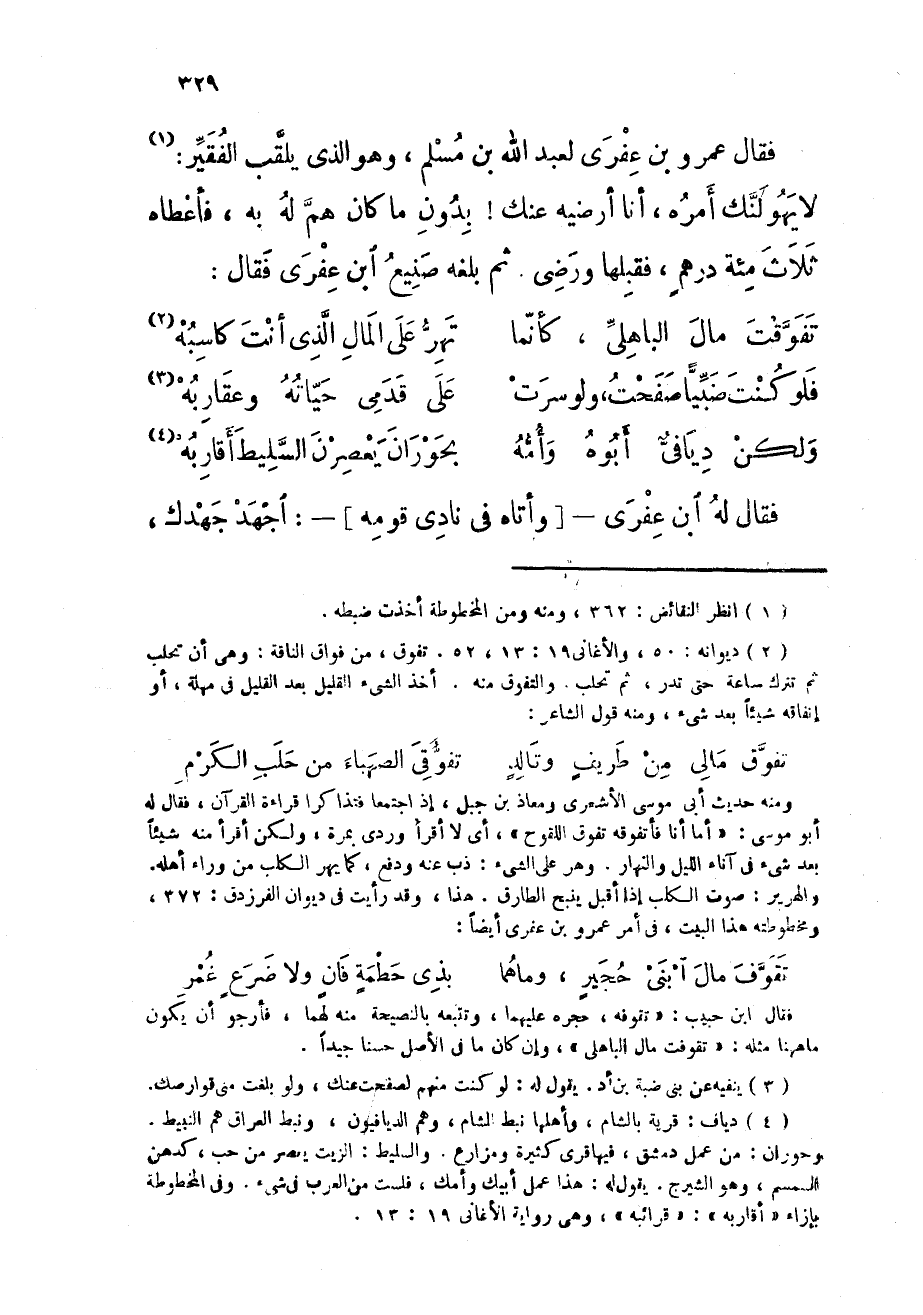 فَقَالَ عَمْرو بن عفرى لعبد الله بن مُسلم وَهُوَ الَّذِي يلقب الْفَقِير لَا يَهو لنك أمره أَنا أرضيه عَنْك بِدُونِ مَا كَانَ هم لَهُ بِهِ فَأعْطَاهُ ثَلَاث مئة دِرْهَم فقبلها وَرَضي ثمَّ بلغه صَنِيع ابْن عفرى فَقَالَ