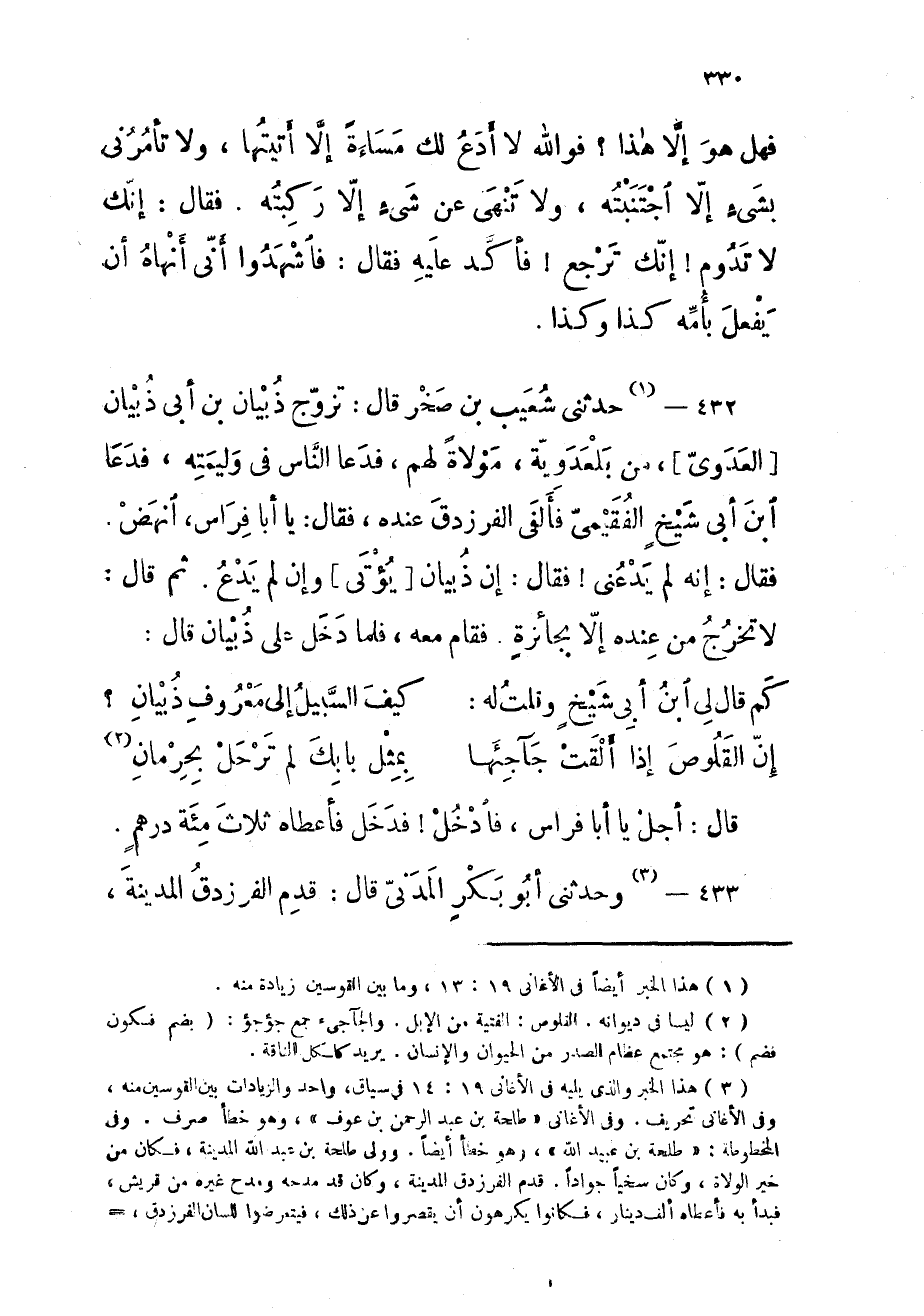 432 - حَدثنِي شُعَيْب بن صَخْر قَالَ تزوج ذبيان بن أَبى ذبيان الْعَدوي من بلعدوية مولاة لَهُم فَدَعَا النَّاس فِي وليمته فَدَعَا ابْن أَبى شيخ الْفُقيْمِي فألفى الفرزدق عِنْده فَقَالَ عِنْده فَقَالَ يَا أَبَا فراس انهض فَقَالَ إِنَّه لم يدعني فَقَالَ إِن ذبيان يُؤْتى وَإِن لم يدع ثمَّ قَالَ لاتخرج من عِنْده إِلَّا بجأنرة فَقَامَ مَعَه فَلَمَّا دخل على ذبيان قَالَ