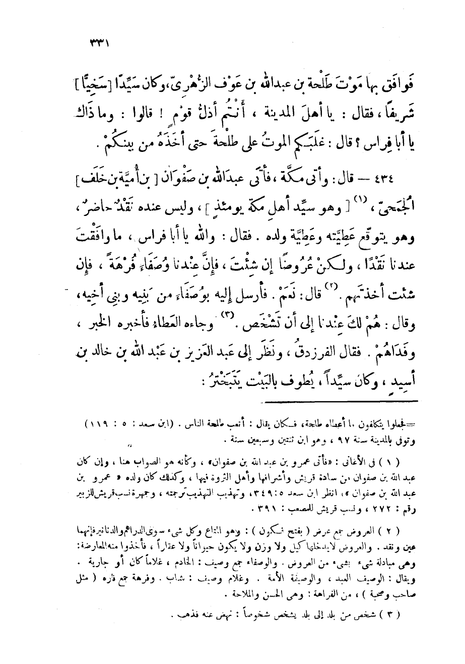 434 - قَالَ وأتى مَكَّة فَأتى عبد الله بن صَفْوَان بن أُميَّة بن خلف الجُمَحِي وَهُوَ سيد أهل مَكَّة يَوْمئِذٍ وَلَيْسَ عِنْده نقد حَاضر وَهُوَ يتَوَقَّع عطيته وعطية وَلَده