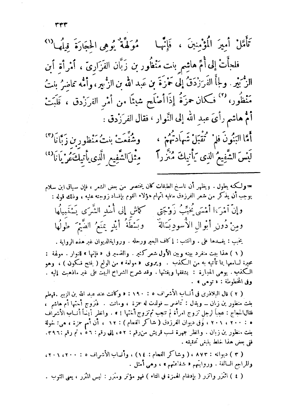 فلجأت إِلَى أم هَاشم بنت مَنْظُور بن زبان الْفَزارِيّ امْرَأَة ابْن الزبير ولجأ الفرزدق إِلَى حَمْزَة بن عبد الله بن الزبير وَأمه تماضر بنت مَنْظُور فَكَانَ حَمْزَة إِذا أصلح شَيْئا من أَمر الفرزدق قلبت أم هَاشم رأى عبد الله إِلَى النوار فَقَالَ الفرزدق