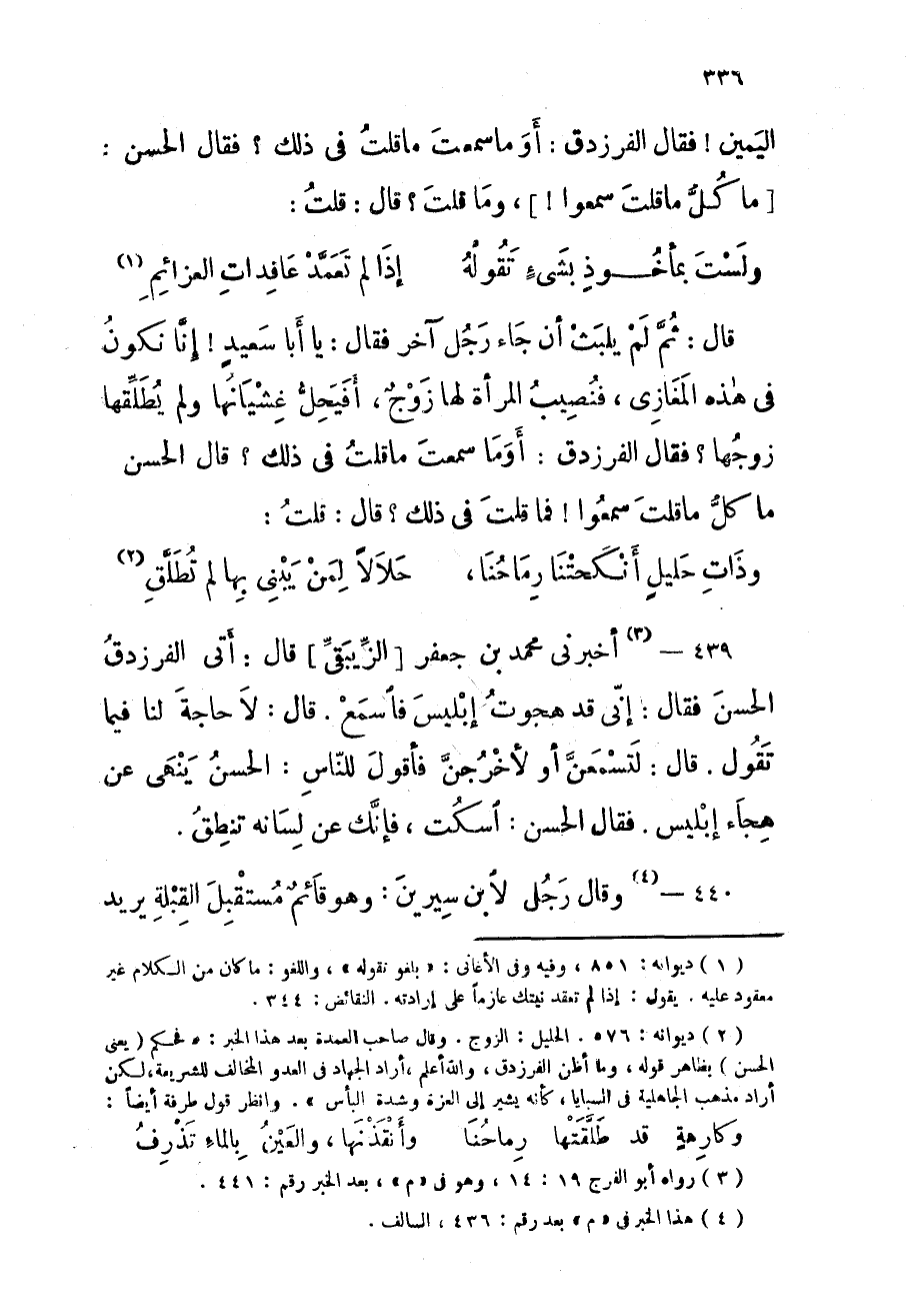 قَالَ ثمَّ لم يلبث أَن جَاءَ رجل آخر فَقَالَ يَا أَبَا سعيد إِنَّا نَكُون فِي هَذِه الْمَغَازِي فنصيب الْمَرْأَة لَهَا زوج أفيحل غشيانها وَلم يطلقهَا زَوجهَا فَقَالَ الفرزدق أَو مَا سَمِعت مَا قلت فِي ذَلِك قَالَ الْحسن مَا كل مَا قلت سمعُوا فَمَا قلت فِي ذَلِك قَالَ قلت