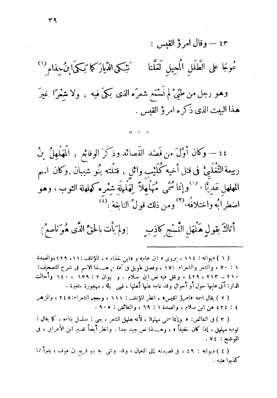 44 - وَكَانَ أول من قصد القصائد وَذكر الوقائع المهلهل بن ربيعَة التغلبى فِي قتل أَخِيه كُلَيْب وَائِل قتلته بَنو شَيبَان وَكَانَ اسْم المهلهل عديا وَإِنَّمَا سمى مهلهلا لهلهلة شعره كهلهلة الثَّوْب وَهُوَ اضطرابه واختلافه وَمن ذَلِك قَول النَّابِغَة