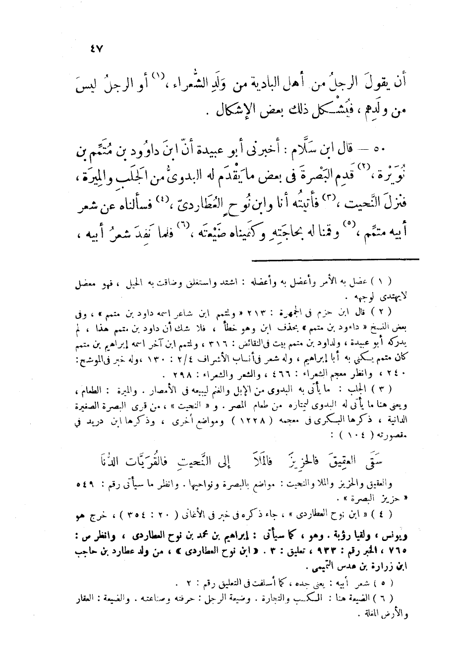 50 - قَالَ ابْن سَلام أخبرنى أَبُو عُبَيْدَة أَن ابْن دَاوُود بن متمم بِمَ نُوَيْرَة قدم الْبَصْرَة فى بعض مَا يقدم لَهُ البدوى من الجلب والميرة فَنزل النحيت فَأَتَيْته أَنا وَابْن نوح العطاردى فَسَأَلْنَاهُ عَن شعر أَبِيه متمم وقمنا لَهُ بحاجته وكفيناه ضيعته فَلَمَّا نفد شعر أَبِيه