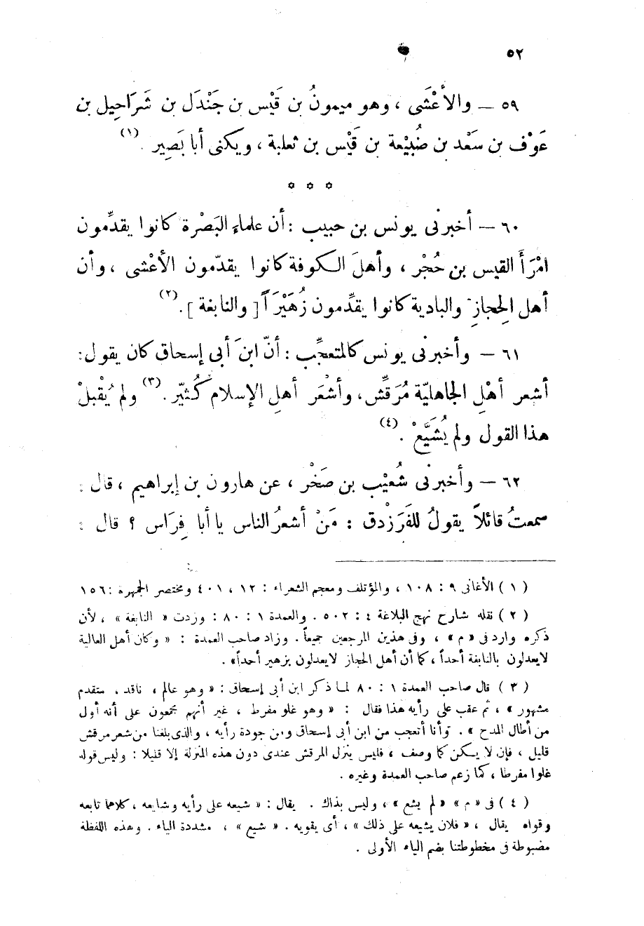 60 - أخبرنى يُونُس بن حبيب أَن عُلَمَاء الْبَصْرَة كَانُوا يقدمُونَ امْرأ الْقَيْس بن حجر وَأهل الْكُوفَة كَانُوا يقدمُونَ الْأَعْشَى وَأَن أهل الْحجاز والبادية كَانُوا يقدمُونَ زهيرا والنابغة
