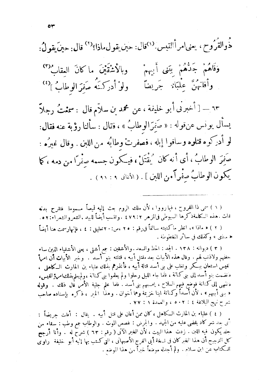63 - أخبرنى أَبُو خَليفَة عَن مُحَمَّد بن سَلام قَالَ سَمِعت رجلا يسْأَل يُونُس عَن قَوْله صفر الوطاب فَقَالَ سَأَلنَا رؤبة عَنهُ فَقَالَ لَو أدركوه قَتَلُوهُ وَسَاقُوا إبِله فصفرت وطابه من اللَّبن