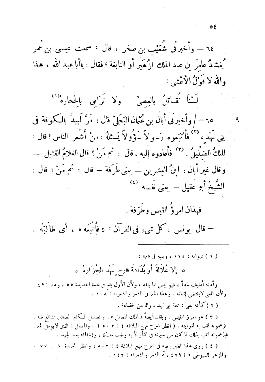 65 - وأخبرنى أبان بن عُثْمَان البجلى قَالَ مر لبيد بِالْكُوفَةِ فى بنى نهد فأتبعوه رَسُولا سؤولا يسئله من أشعر النَّاس قَالَ الْملك الضليل