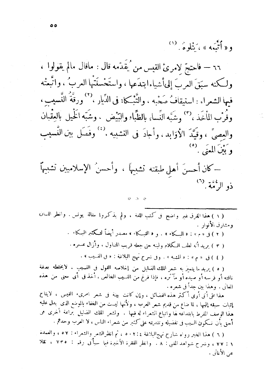 66 - فاحتج لامرئ الْقَيْس من يقدمهُ قَالَ مَا قَالَ مَا لم يَقُولُوا وَلكنه سبق الْعَرَب إِلَى أَشْيَاء ابتدعها واستحسنتها الْعَرَب واتبعته فِيهَا الشُّعَرَاء استيقاف صَحبه والتبكاء فى الديار ورقة النسيب وَقرب المأخذ وَشبه النِّسَاء بالظباء وَالْبيض وَشبه الْخَيل بالعقبان والعصى وَقيد الأوابد وأجاد فِي التَّشْبِيه وَفصل بَين النسيب وَبَين الْمَعْنى