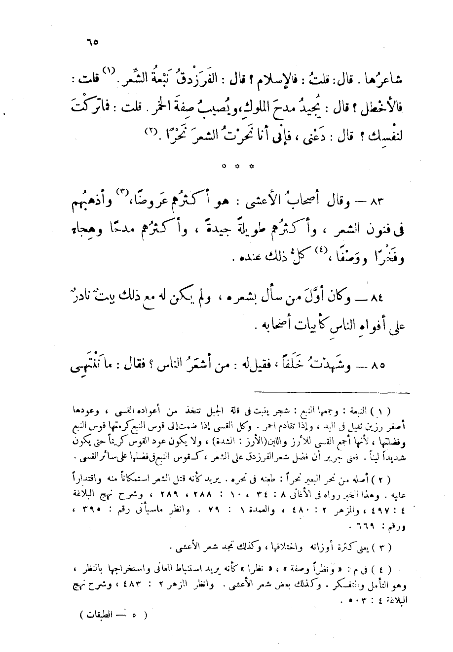 83 - وَقَالَ أَصْحَاب الْأَعْشَى هُوَ أَكْثَرهم عرُوضا وأذهبهم فى فنون الشّعْر وَأَكْثَرهم طَوِيلَة جَيِّدَة وَأَكْثَرهم مدحا وهجاء وفخرا ووصفا كل ذَلِك عِنْده