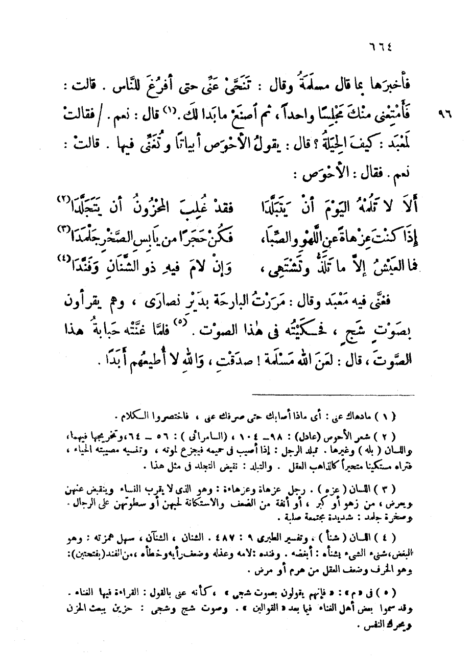 فَأَخْبرهَا بِمَا قَالَ مسلمة وَقَالَ تنحى عَنى حَتَّى أفرغ للنَّاس قَالَت فأمتعنى مِنْك مَجْلِسا وَاحِدًا ثمَّ اصْنَع مَا بدا لَك قَالَ نعم فَقَالَت لمعبد كَيفَ الْحِيلَة قَالَ يَقُول الْأَحْوَص أبياتا وتغنى فِيهَا قَالَت نعم فَقَالَ الْأَحْوَص