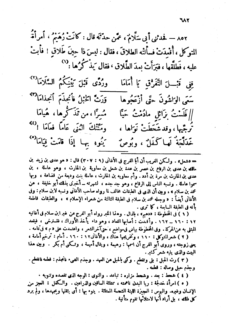 852 - فَحَدثني أبي سَلام عَمَّن حَدثهُ قَالَ كَانَت رهيم امْرَأَة المتَوَكل أقعدت فَسَأَلته الطَّلَاق فَقَالَ لَيْسَ ذَا حِين طَلَاق فَأَبت عَلَيْهِ فَطلقهَا فبرأت بعد الطَّلَاق فَقَالَ يذكرهَا