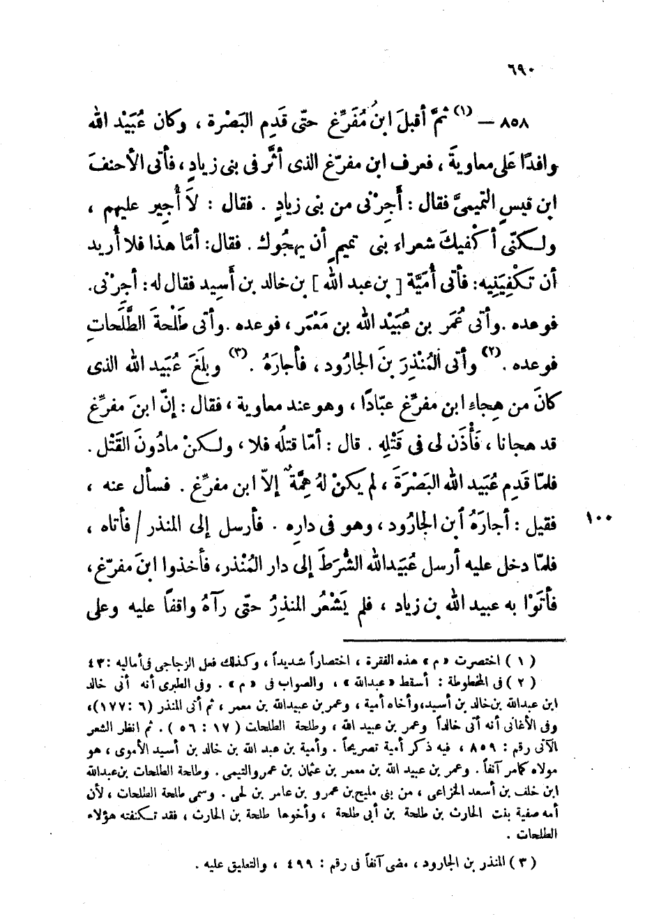 858 - ثمَّ أقبل ابْن مفرغ حَتَّى قدم الْبَصْرَة وَكَانَ عبيد الله وافدا على مُعَاوِيَة فَعرف ابْن مفرغ الذى أثر فِي بني زِيَاد فَأتي الْأَحْنَف ابْن قيس التَّمِيمِي فَقَالَ أجرني من بني زِيَاد فَقَالَ لَا أجِير عَلَيْهِم وَلَكِنِّي أكفيك شعراء بني تَمِيم أَن يهجوك فَقَالَ أما هَذَا فَلَا أُرِيد أَن تكفينيه فَأتى أُميَّة بن عبد الله بن خَالِد بن أسيد فَقَالَ لَهُ أجرني فوعده وأتى عمر بن عبيد الله بن معمر وأتى طَلْحَة الطلحات فوعده وأتى الْمُنْذر بن الْجَارُود فأجاره وَبلغ عبيد الله الَّذِي كَانَ من هجاء ابْن مفرغ عبادا وَهُوَ عِنْد مُعَاوِيَة فَقَالَ إِن ابْن مفرغ قد هجانا فَأذن لي فِي قَتله قَالَ أما قَتله فَلَا وَلَكِن مادون الْقَتْل فَلَمَّا قدم عبيد الله الْبَصْرَة لم يكن لَهُ همة إِلَّا ابْن مفرغ فَسَأَلَ عَنهُ فَقيل أجاره ابْن الْجَارُود وَهُوَ فِي دَاره فَأرْسل إِلَى الْمُنْذر فَأَتَاهُ فَلَمَّا دخل عَلَيْهِ أرسل عبيد الله الشَّرْط إِلَى دَار الْمُنْذر فَأخذُوا ابْن مفرغ فَأتوا بِهِ عبيد الله بن زِيَاد فَلم يشْعر الْمُنْذر حَتَّى رَآهُ وَاقِفًا عَلَيْهِ وعَلى