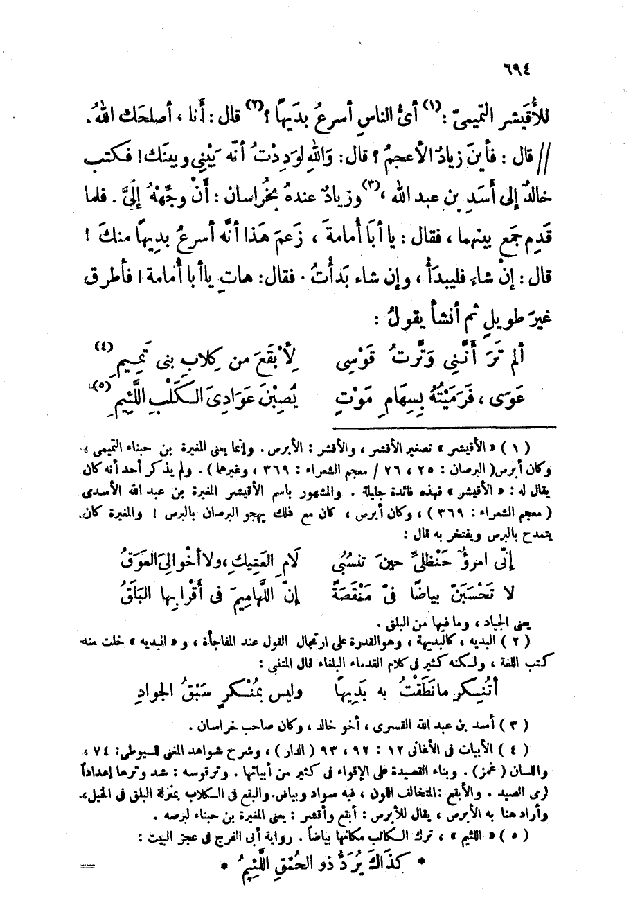 للأقيشر التَّمِيمِي أَي النَّاس أسْرع بديها قَالَ أَنا أصلحك الله قَالَ فَأَيْنَ زِيَاد الْأَعْجَم قَالَ وَالله لَوَدِدْت أَنه بينى وَبَيْنك فَكتب خَالِد إِلَى أَسد بن عبد الله وَزِيَاد عِنْده بخراسان أَن وَجهه إِلَيّ فَلَمَّا قدم جمع بَينهمَا فَقَالَ يَا أَبَا امامة زعم هَذَا أَنه أسْرع بديها مِنْك قَالَ إِن شَاءَ فليبدأ وَإِن شَاءَ بدأت فَقَالَ هَات يَا أَبَا أُمَامَة فَأَطْرَقَ غير طَوِيل ثمَّ أنشأ يَقُول
