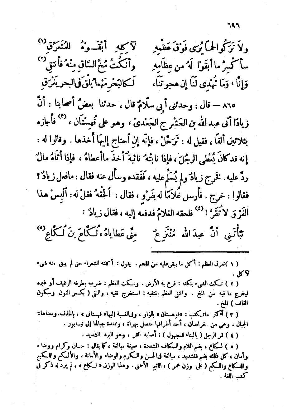 865 - قَالَ وحَدثني أبي سَلام قَالَ حَدثنَا بعض أَصْحَابنَا أَن زيادا أَتَى عبد الله بن الحشرج الجعدى وَهُوَ على قهستان فَأَجَازَهُ بِثَلَاثِينَ ألفا فَقيل لَهُ ترحل فَإِنَّهُ إِن احْتَاجَ إِلَيْهَا أَخذهَا وَقَالُوا لَهُ إِنَّه قد كَانَ يعْطى الرجل فَإِذا نابته نائبة أَخذ مَا أعطَاهُ فَإِذا أَتَاهُ مَال رد عَلَيْهِ فَخرج زِيَاد وَلم يسلم عَلَيْهِ فَفَقدهُ وَسَأَلَ عَنهُ فَقَالَ مَا فعل زِيَاد فَقَالُوا خرج فَأرْسل غُلَاما لَهُ بِفَرْوٍ فَقَالَ الْحَقْهُ فَقل لَهُ البس هَذَا الفرو لَا تقر فَلحقه الْغُلَام فَدفعهُ إِلَيْهِ فَقَالَ زِيَاد