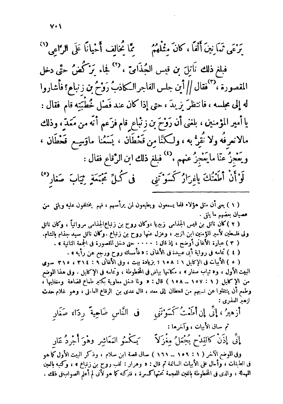 فَبلغ ذَلِك ناتل بن قيس الجذامى فجَاء يرْكض حَتَّى دخل الْمَقْصُورَة فَقَالَ أَيْن جلس الْفَاجِر الْكَاذِب روح بن زنباع فأشاروا لَهُ إِلَى مَجْلِسه فانتظر يزِيد حَتَّى إِذا كَانَ عِنْد فصل خطبَته قَامَ فَقَالَ يَا أَمِير الْمُؤمنِينَ بلغنى أَن روح بن زنباع قَامَ فَزعم أَنه من معد وَذَلِكَ مَالا نعرفه وَلَا نقر بِهِ وَلَكنَّا من قحطان يسعنا مَا وسع قحطان ويعجز عَنَّا مَا يعجز عَنْهُم فَبلغ ذَلِك ابْن الرّقاع فَقَالَ