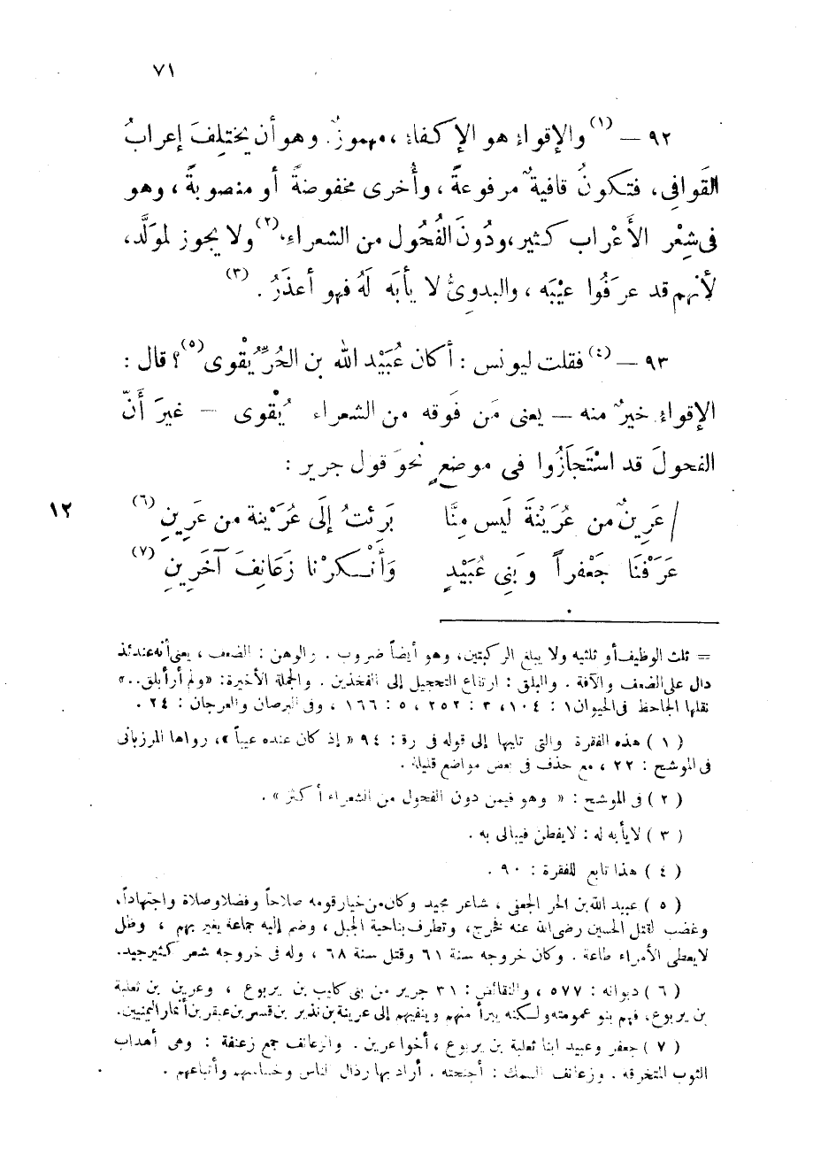 93 - فَقلت ليونس أَكَانَ عبيد الله بن الْحر يقوى قَالَ الإقواء خير مِنْهُ يعْنى من فَوْقه من الشُّعَرَاء يقوى غير أَن الفحول قد استجاوزا فى مَوضِع نَحْو قَول جرير