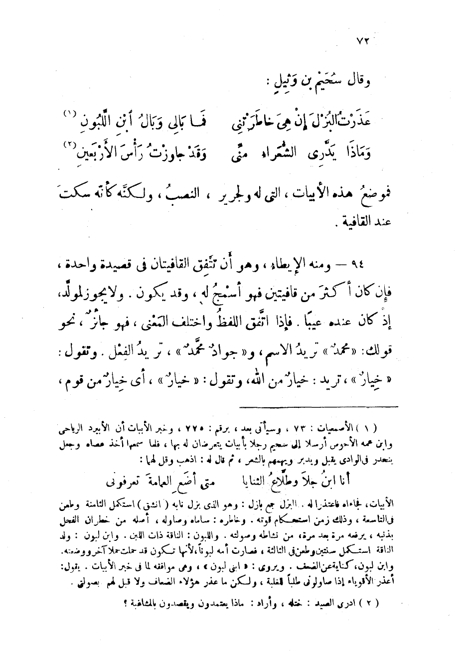 94 - وَمِنْه الإيطاء وَهُوَ أَن تتفق القافيتان فى قصيدة وَاحِدَة فَإِن كَانَ أَكثر من قافيتين فَهُوَ أسمج لَهُ وَقد يكون