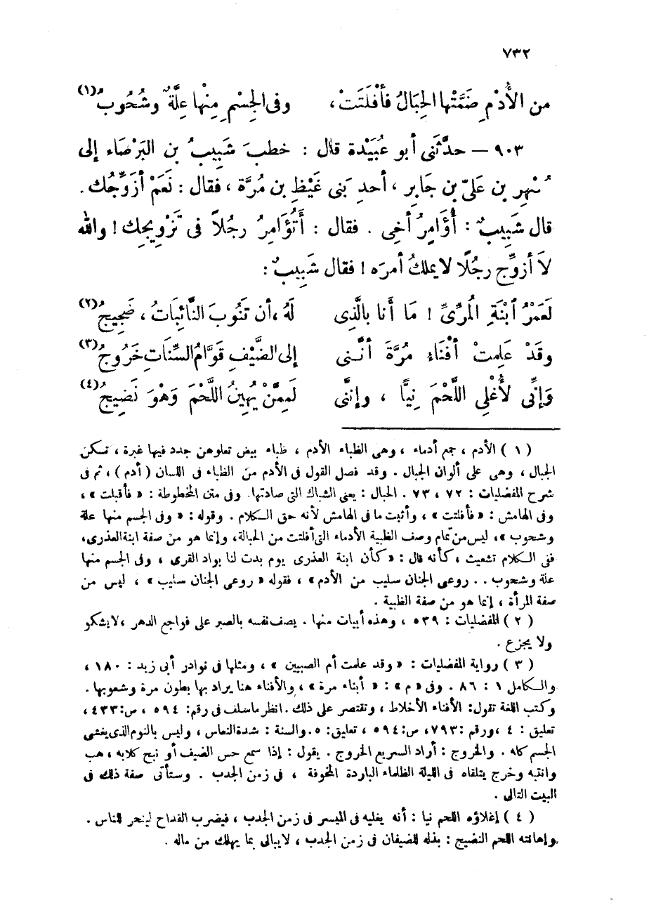 903 - حَدَّثَنى أَبُو عُبَيْدَة قَالَ خطب شبيب بن البرصاء إِلَى مهر بن على بن جَابر أحد بنى غيظ بن مرّة فَقَالَ نعم أزَوجك قَالَ شبيب أؤامر أخى فَقَالَ أتؤامر رجلا فى تزويجك وَالله لَا أزوج رجلا لَا يملك أمره فَقَالَ شبيب