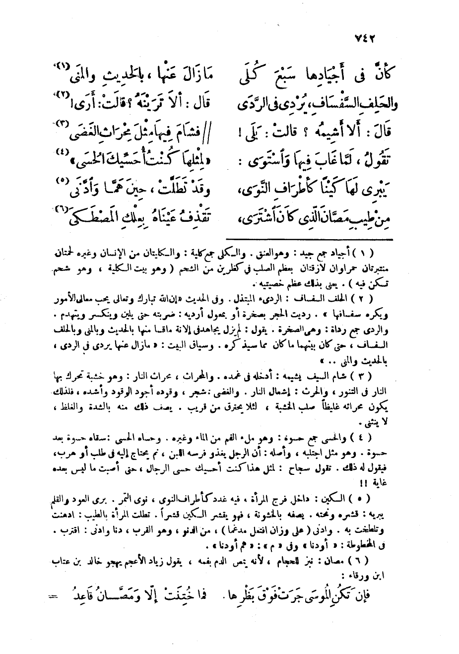 (كَأَن فى أجيادها سبع كلى ... مازال عَنْهَا بِالْحَدِيثِ والمنى)