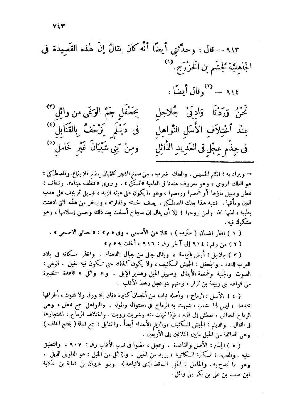 913 - قَالَ وحدثنى أَيْضا أَنه كَانَ يُقَال إِن هَذِه القصيدة فى الْجَاهِلِيَّة لجشم بن الْخَزْرَج