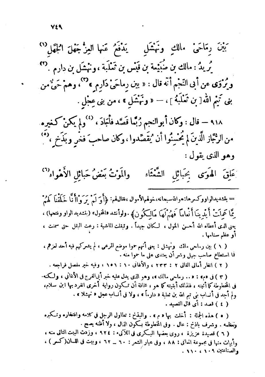 918 - قَالَ وَكَانَ أَبُو النَّجْم رُبمَا قصد فأجاد وَلم يكن كَغَيْرِهِ من الرجاز الَّذين لم يحسنوا أَن يقصدوا وَكَانَ صَاحب فَخر وبذخ وَهُوَ الذى يَقُول