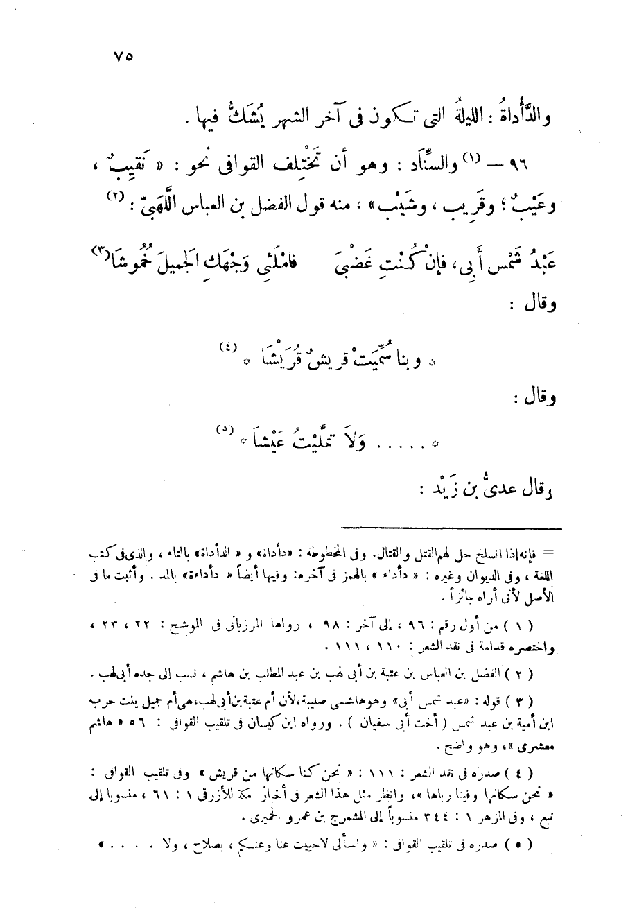 96 - والسناد وَهُوَ أَن تخْتَلف القوافى نَحْو نقيب وعيب وَقَرِيب وشيب مِنْهُ قَول الْفضل بن الْعَبَّاس اللهبى