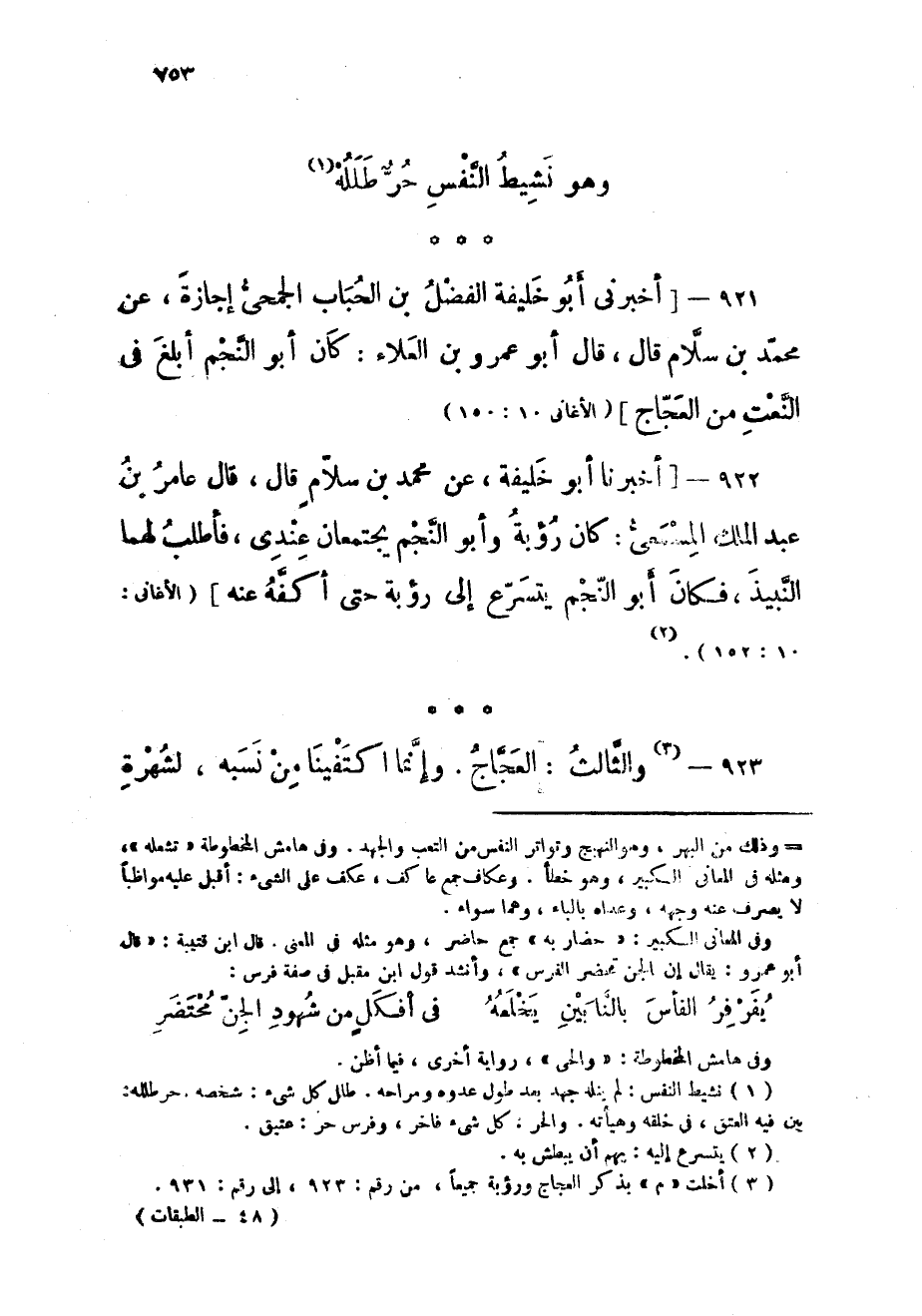 921 - أخبرنى أَبُو خَليفَة الْفضل بن الْحباب الجمحى إجَازَة عَن مُحَمَّد بن سَلام قَالَ قَالَ أَبُو عَمْرو بن الْعَلَاء كَانَ أَبُو النَّجْم أبلغ فى النَّعْت من العجاج