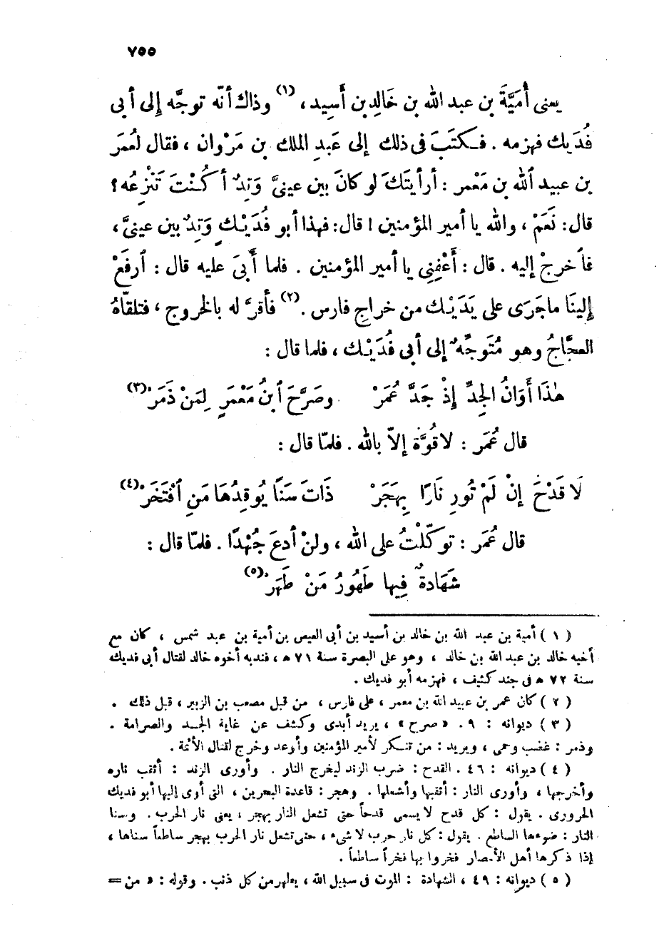 يعْنى أُميَّة بن عبد الله بن خَالِد بن أسيد وَذَاكَ أَنه توجه إِلَى أبي فديك فَهَزَمَهُ فَكتب فى ذَلِك إِلَى عبد الْملك بن مَرْوَان فَقَالَ لعمر بن عبيد الله بن معمر أرأيتك لَو كَانَ بَين عينى وتد أَكنت تنزعه قَالَ نعم وَالله يَا أَمِير الْمُؤمنِينَ قَالَ فَهَذَا أَبُو فديك وتد بَين عينى فَاخْرُج إِلَيْهِ قَالَ أعفنى يَا أَمِير الْمُؤمنِينَ فَلَمَّا أبي عَلَيْهِ قَالَ ارْفَعْ إِلَيْنَا ماجرى على يَديك من خراج فَارس فَأقر لَهُ بِالْخرُوجِ فَتَلقاهُ العجاج وَهُوَ مُتَوَجّه إِلَى أبي فديك فَلَمَّا قَالَ