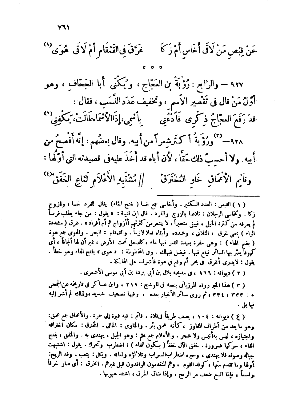 928 - ورؤبة أَكثر شعرًا من أَبِيه وَقَالَ بَعضهم إِنَّه أفْصح من أَبِيه وَلَا أَحسب ذَلِك حَقًا لِأَن أَبَاهُ قد أَخذ عَلَيْهِ فى قصيدته الَّتِى أَولهَا